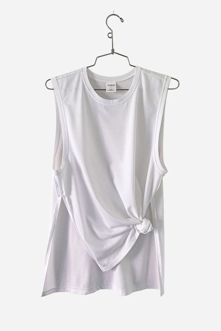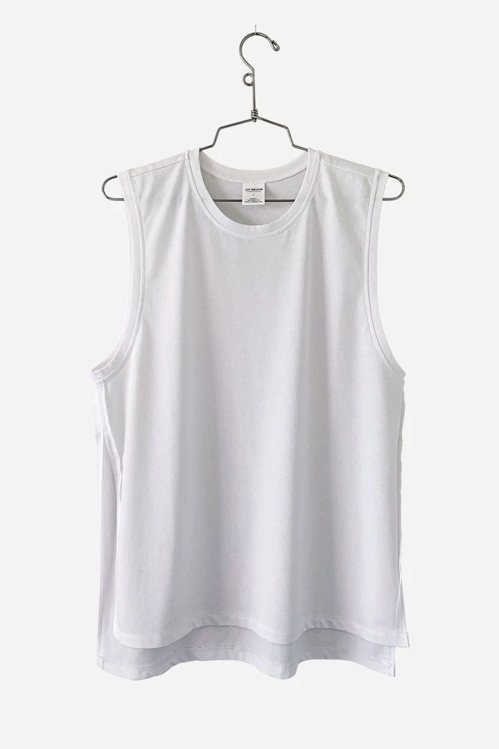 A relaxed fit, drop armhole, crew neck tank with high-low hem and side slits.