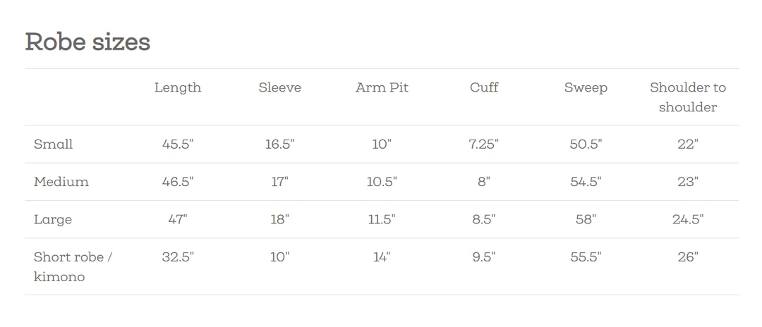 • Robes are unisex, sized in men’s sizes