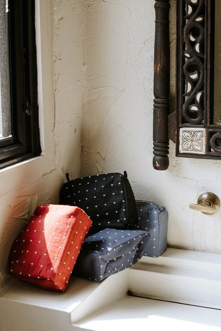 The size of this compact toiletry bag is perfect for your daily essentials and favorite products. The flexible organic-cotton canvas, with a hand embroidered cross stitch, is designed to easily fit into any overnight bag, purse or tote.