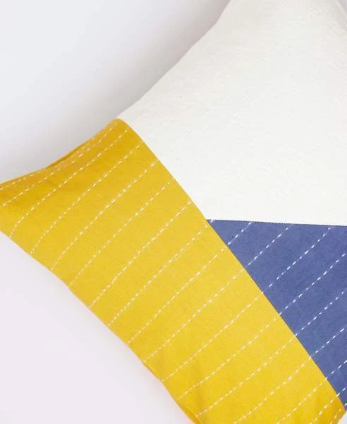 The Asha throw pillow features vibrant geometric patchwork with contemporary embroidered accents. Colorblocks of contrasting patterns make it a vibrant addition to any space. Add a touch of visual luxury to your home decor with this hand-stitched organic cotton pillow, a beautiful companion to your Asha quilted bedspread and lumbar pillow.