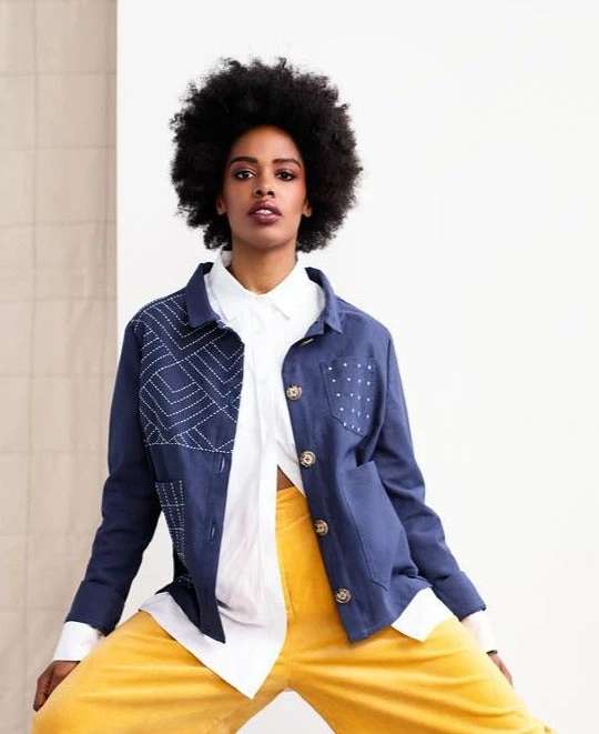 This twill-canvas chore jacket features modern pattern blocking with three front-patch pockets, a delicate cross-stitch design, and an art deco-inspired style. Its boxy fit and button-front closure make this jacket perfect for layering over a basic t-shirt or cozy sweater.