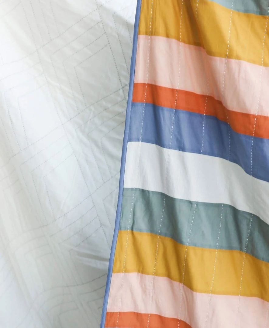 Ribbons of soft-to-the-touch organic cotton are sewn together and then hand-embroidered using traditional kantha stitching techniques to create this playfully striped quilt. Draped over a chair, folded on the end of a bed or even used in a nursery, the ribbon throw quilt is the perfect modern quilt for your living space for years to come. Made by an artisan in Ajmer, India, this product is Fair Trade Verified and features a hand-stitched signature of the maker.