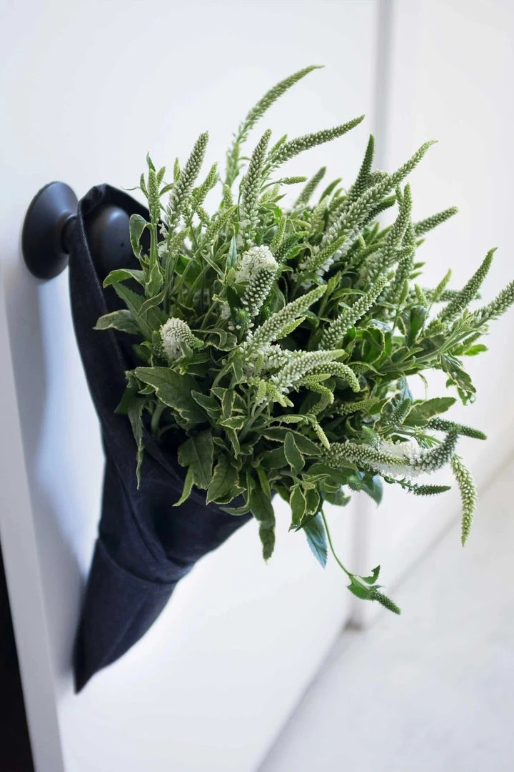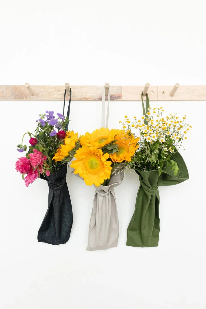 The reusable flower garden tote is designed to hold flowers, garden stems, and herbs. The two straps wrap around and tie in front for easy bundling, while the back-seam opening easily hooks on a wall or doorknob to hang vertically.