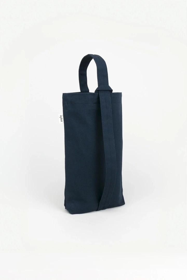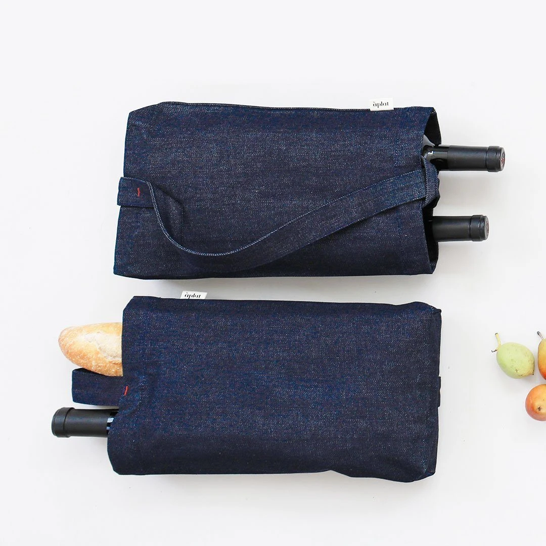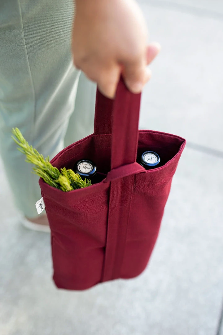 This Vin Wine Tote is designed to hold two bottles, with an interior sleeve for added protection. The adjustable strap can be carried from the top or slung over the shoulder. Perfect for casual picnics, toting wine, and gifting for all occasions. Holds two standard bottles as wide as 4 1/2” in diameter vertically, or a baguette and bundles of flowers.
