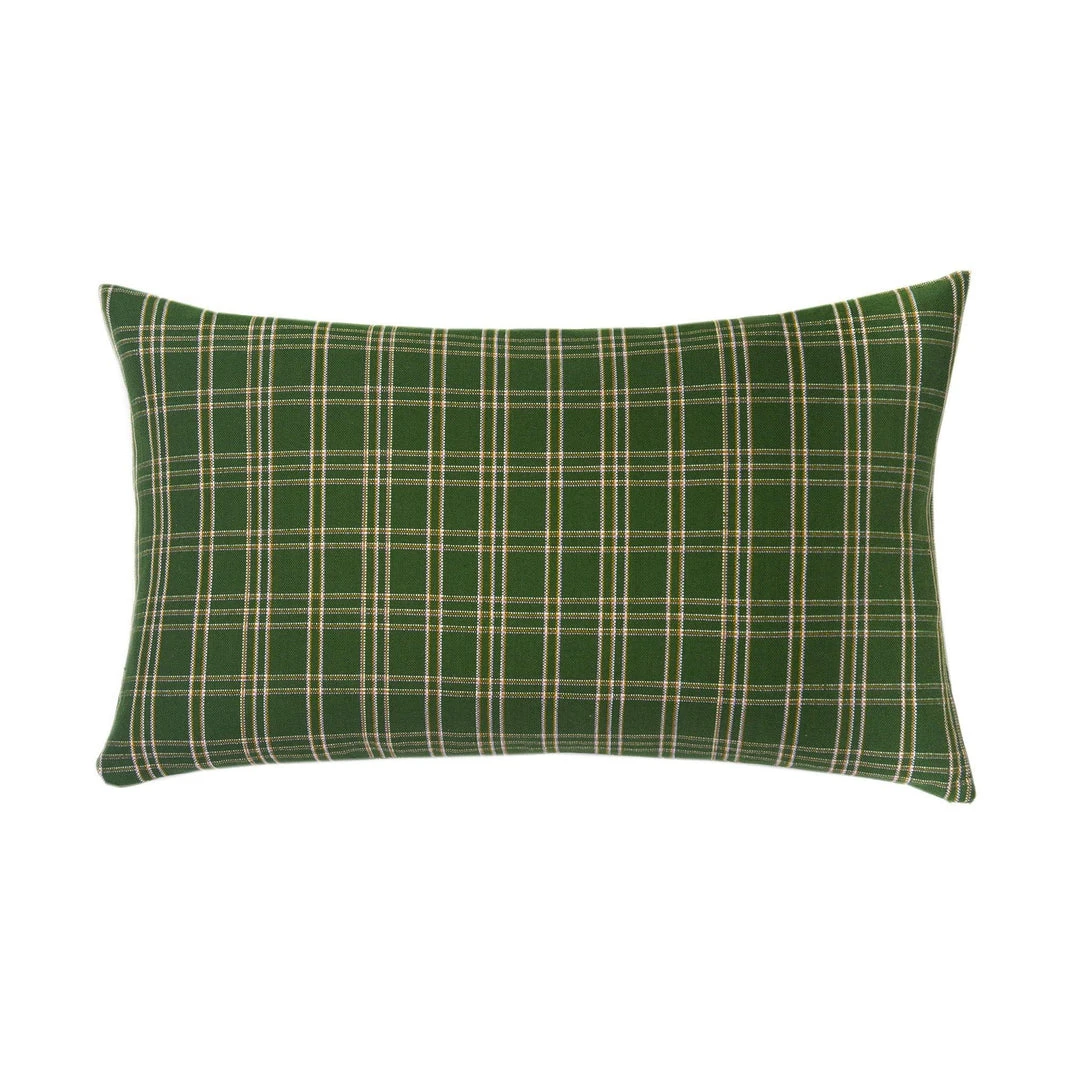 Forest green plaid throw pillow, ethically handwoven by artisans in Chiapas, Mexico on traditional footlooms. With hints of ochre and burgundy, this update on a classic plaid will be a lively addition to any decor.