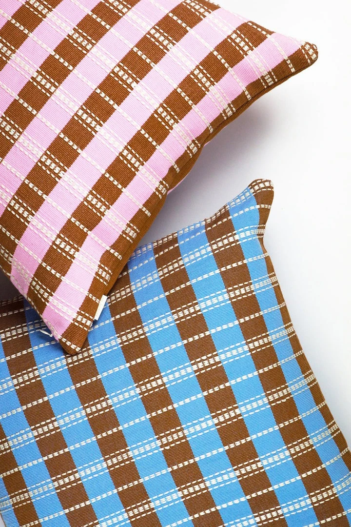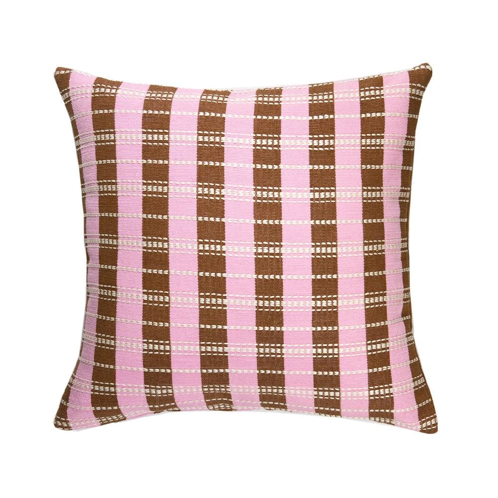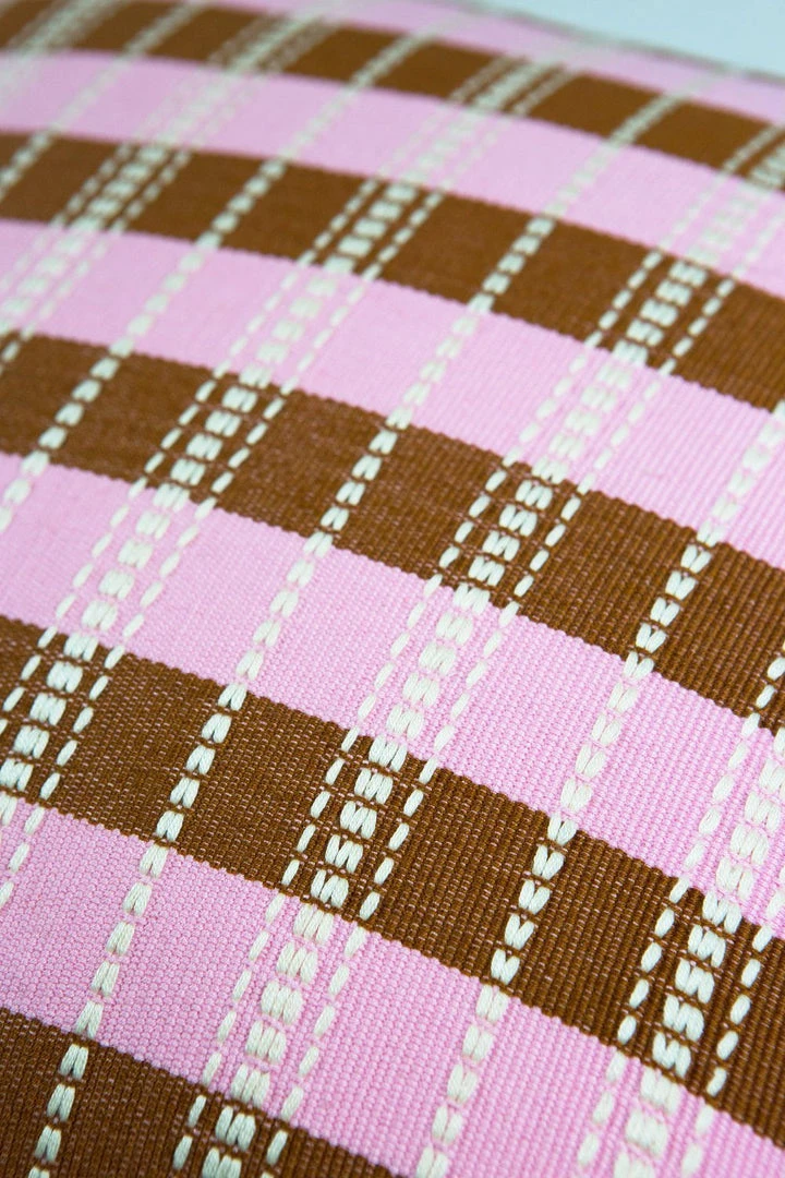 This baby pink pillow was handwoven on a back-strap loom by artisans from the village of Nahuala, Guatemala.