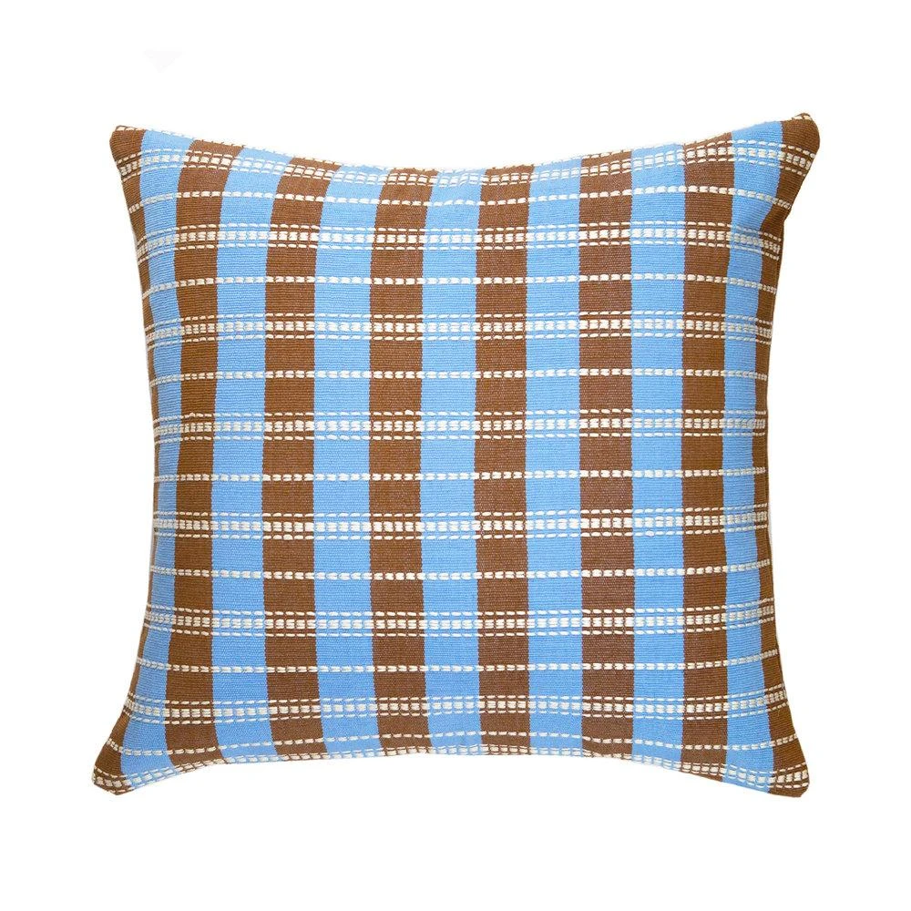 This blue pillow was handwoven on a back-strap loom by artisans from the village of Nahuala, Guatemala.