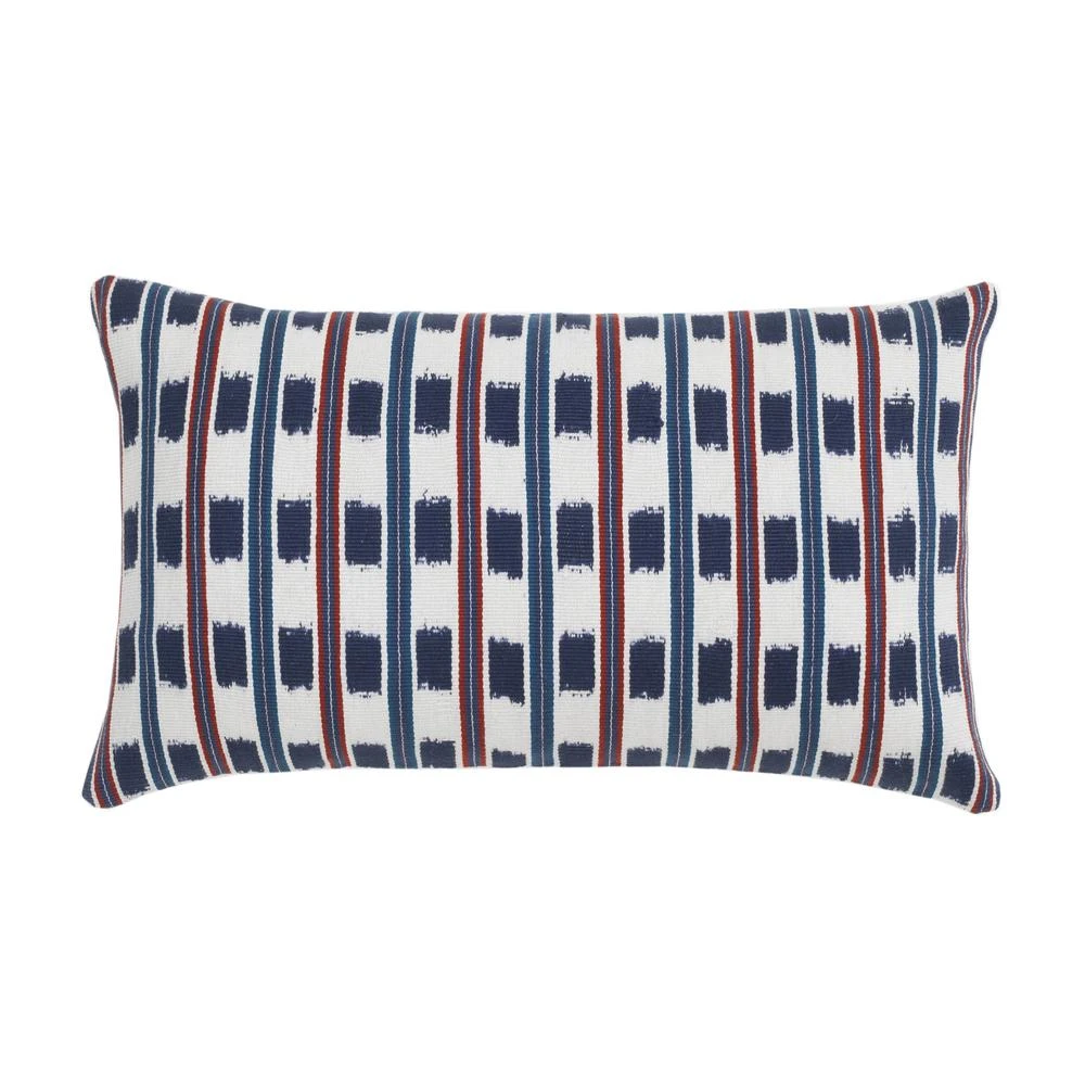 This blue pillow was handwoven on a back-strap loom by artisans from the village of Nahuala, Guatemala.
