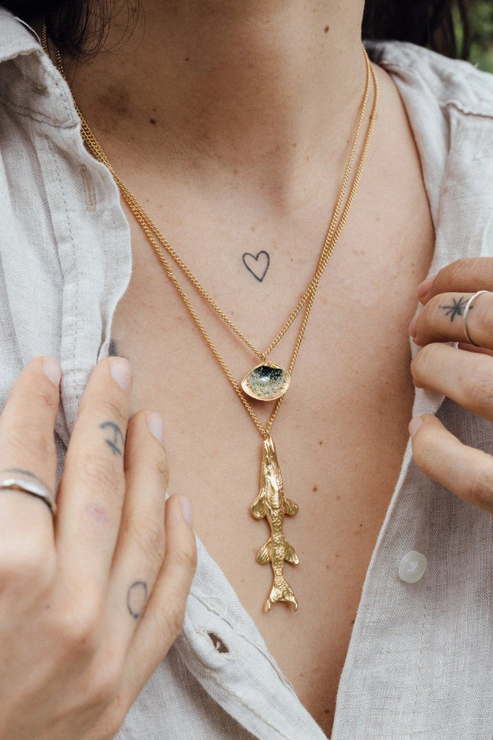 This unique necklace is inspired by the colors and textures of the ocean. Add a bit of shine to any outfit with this handcrafted, responsibly sourced piece. The barracuda, also known as the tiger of the sea, is long, fast, and enjoys being close to coral reefs where she’s able to hide and surprise her prey.