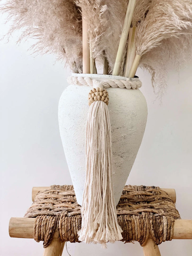 This beaded tassel is the perfect bohemian accent to a table or bookshelf. They also rest nicely on a nightstand or ottoman, can be hung on a wall, or even used as curtain ties. The unique shell is sourced in Java and brings a rich global feel into the home. Each individual bead is hand-carved, and then strung, and tied to a 100% cotton tassel to make these beautiful accent pieces.