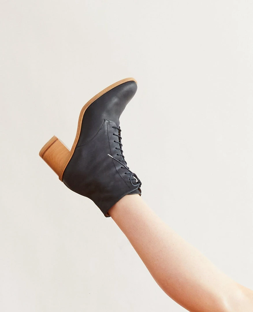 Elegantly casual, the Bina Boot offers a fresh take on the time honored lace-up boot. Featuring a 10 eyelet lace-up and an inside zip closure. A carefully layered wood heel sets this boot apart from the rest, slightly inset from the sole.