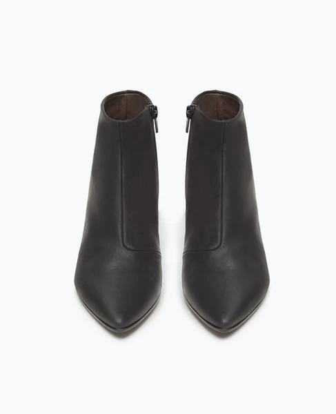 A timeless day-to-night wardrobe essential, the Whoop pointed toe ankle bootie is made up in supple black leather. Featuring a sculpted solid wood oval heel in an elegant chestnut hue. Wear casually with cropped raw-edged denim or dress her up with silky lounge pants.