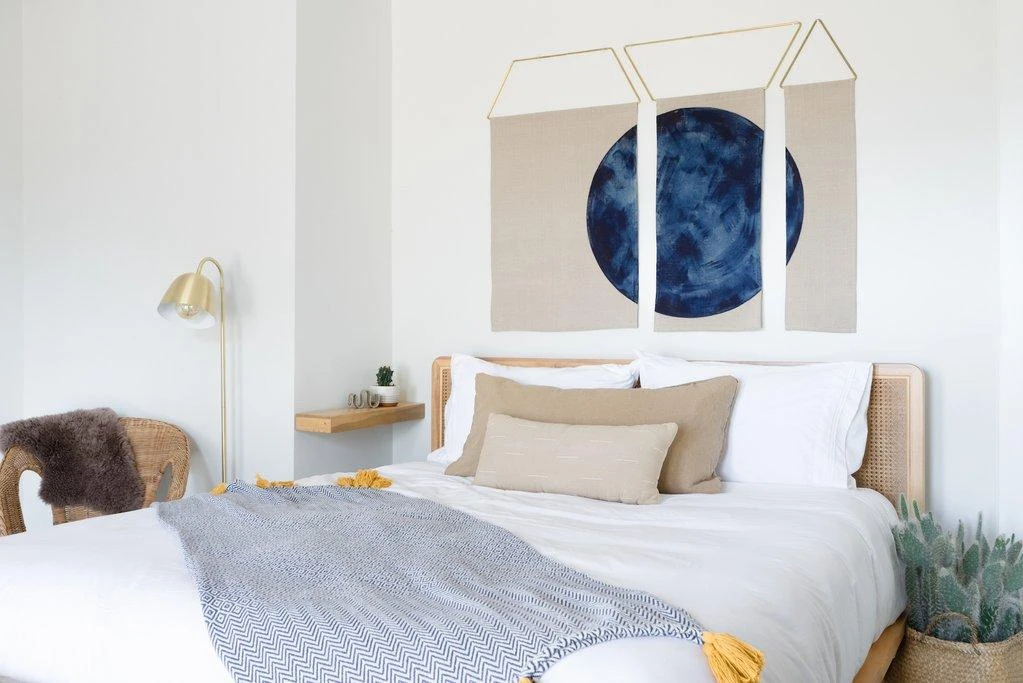 These minimalist wall hangings are hand-painted in Los Angeles using indigo artist’s acrylics and graphite. The raw, solid brass hardware was machined in Los Angeles as well. Each piece is made just for you, making them one of a kind.