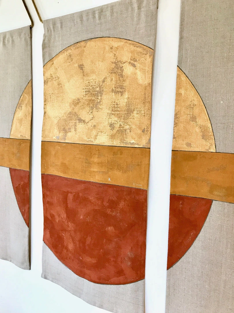 These contemporary, three-panel wall hangings are hand-painted in Los Angeles using metallic gold, ochre, and earth artist’s acrylics and graphite on natural linen. The raw, solid brass hardware was machined in Los Angeles as well. Each piece is made just for you, making them one of a kind.