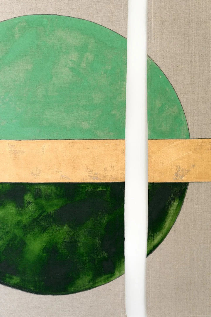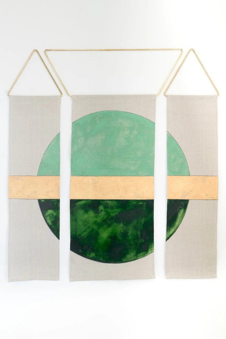 These contemporary, three-panel wall hangings are hand-painted in Los Angeles using metallic gold, light, and dark green artist’s acrylics and graphite on beige linen. The raw, solid brass hardware was machined in Los Angeles as well. Each piece is made just for you, making them one of a kind.