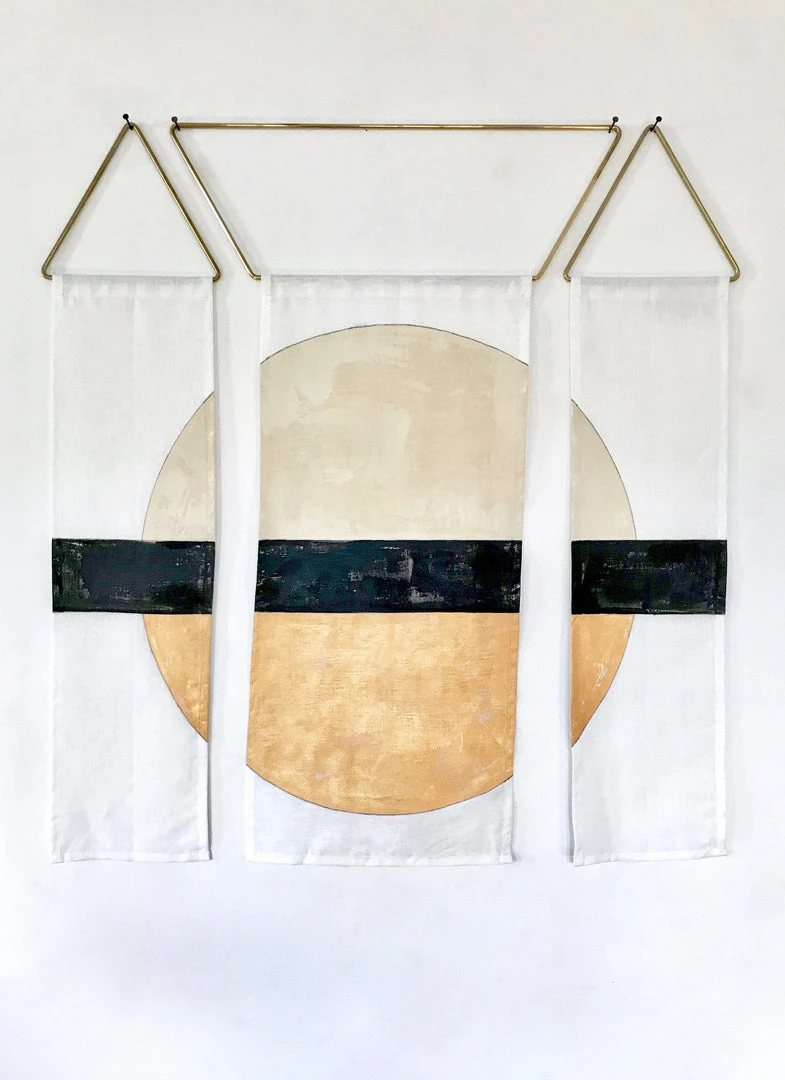 These contemporary, three-panel wall hangings are hand-painted in Los Angeles using oyster, carbon black, and metallic gold artist’s acrylics and graphite on ivory linen. The raw, solid brass hardware was machined in Los Angeles as well. Each piece is made just for you, making them one of a kind.