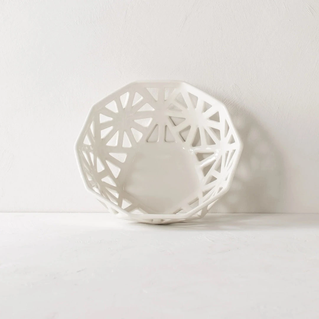 The Geodesic Fruit Bowl features repetitious, hand-carved, architectural design cut outs. The modern, yet timeless, design will serve as a statement piece within your home.