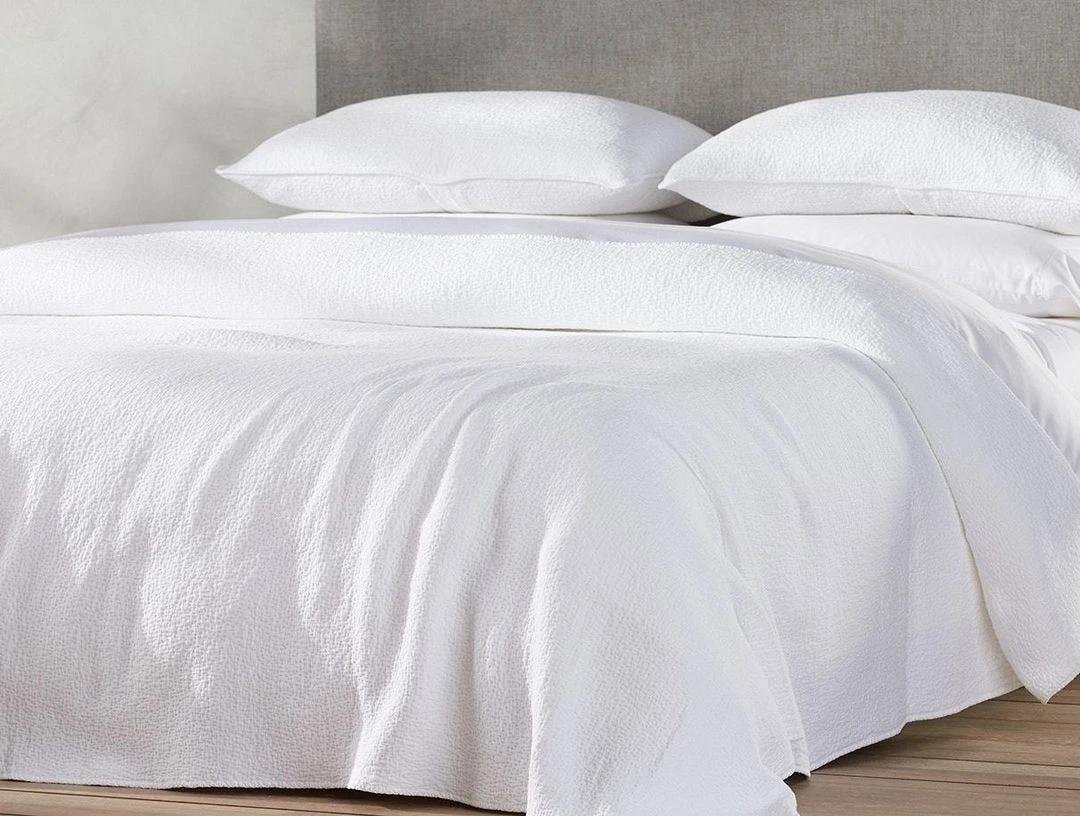 This Matelassรฉ coverlet pairs a light, lofty feel with an allover stitched texture inspired by quilted Kantha cloth. The coverlet is finished with a simple bound edge, for endless versatility and effortless layering.
