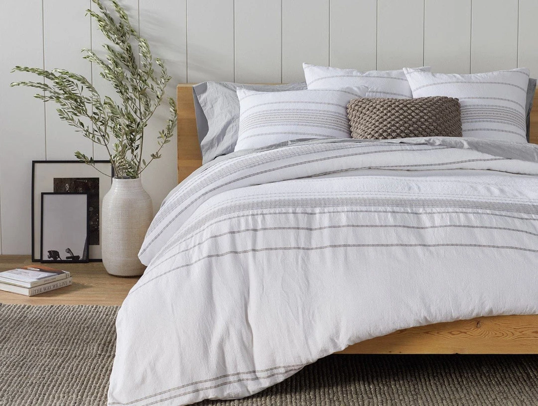 Textural, dobby-woven stripes traverse soft, organic cotton to create a duvet cover that’s vibrant yet versatile. Prewashed for softness, it’ll look as relaxed and inviting years from now as it does today. Duvet is self-backed and finished with a simple knife-edge, coconut shell buttons and inside ties.