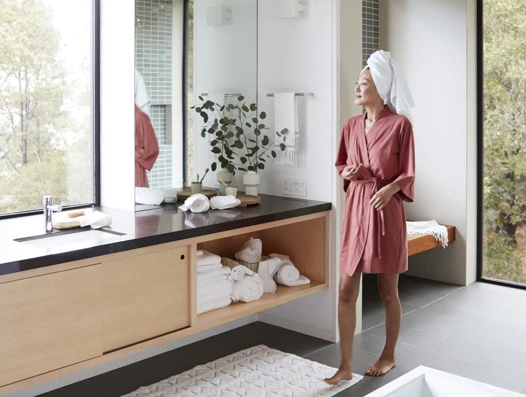 The softest, most substantial jersey knit is brushed for a perfectly peached finish, giving this organic cotton robe the coziest touch. This relaxed silhouette features three-quarter-length sleeves, collar band, and self-belt with dog-eared loops for easy adjustability. Topstitched pockets sit at the hips, with a 2” hemline that hits at the knee. Length for Size: XS: 35″, S: 36″, M: 37″, L: 38″.