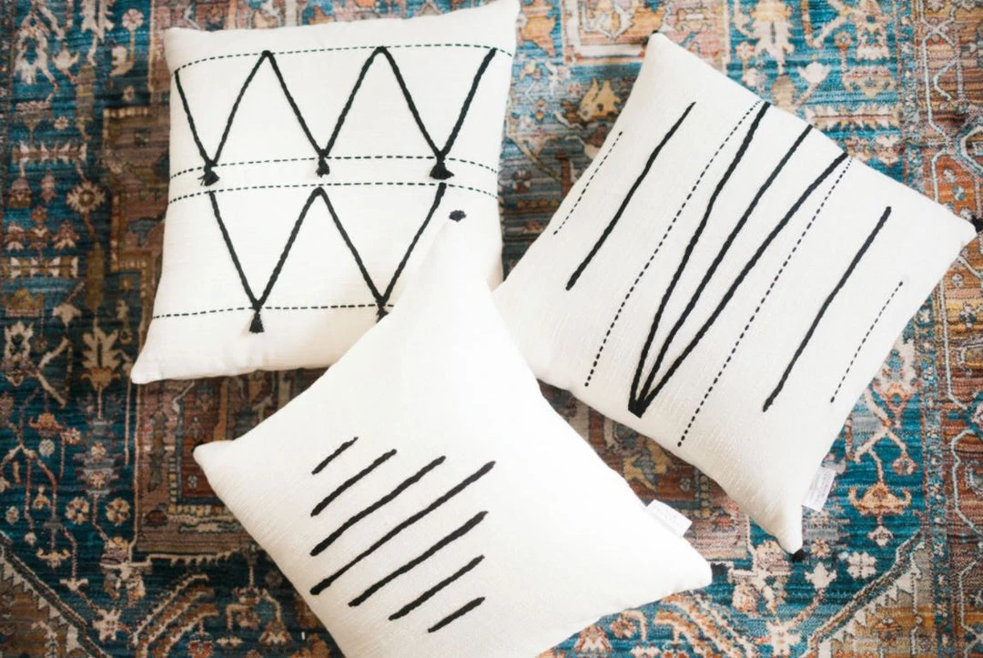 The Carthage Throw Pillow draws inspiration from Tunisia’s Berber heritage. Each pillow is watchfully spun, woven and embroidered by a small mother-daughter led group of women in Tunisia’s capital city, Tunis.