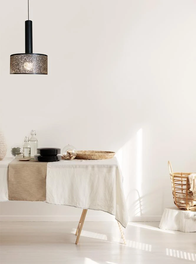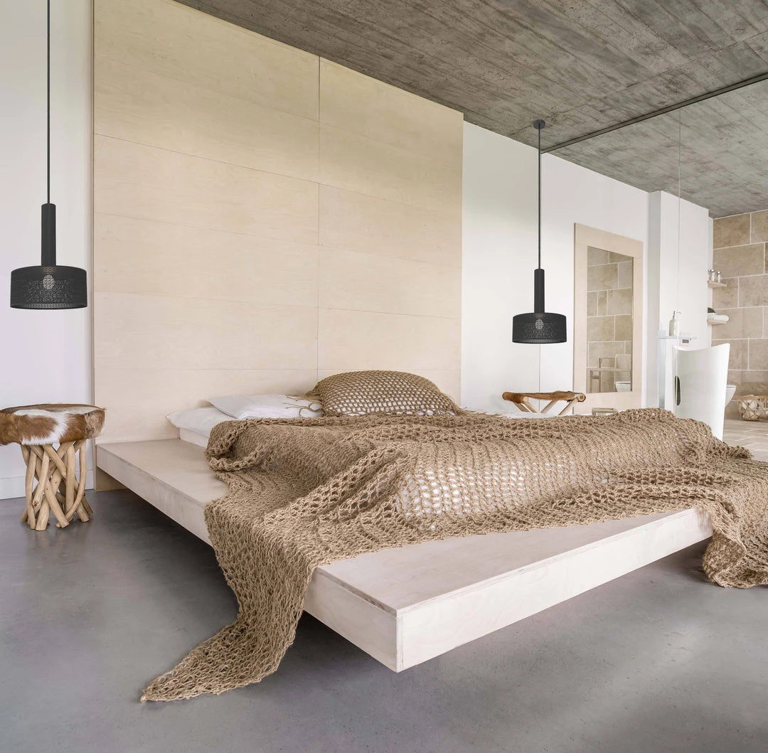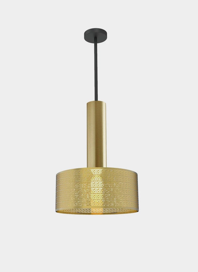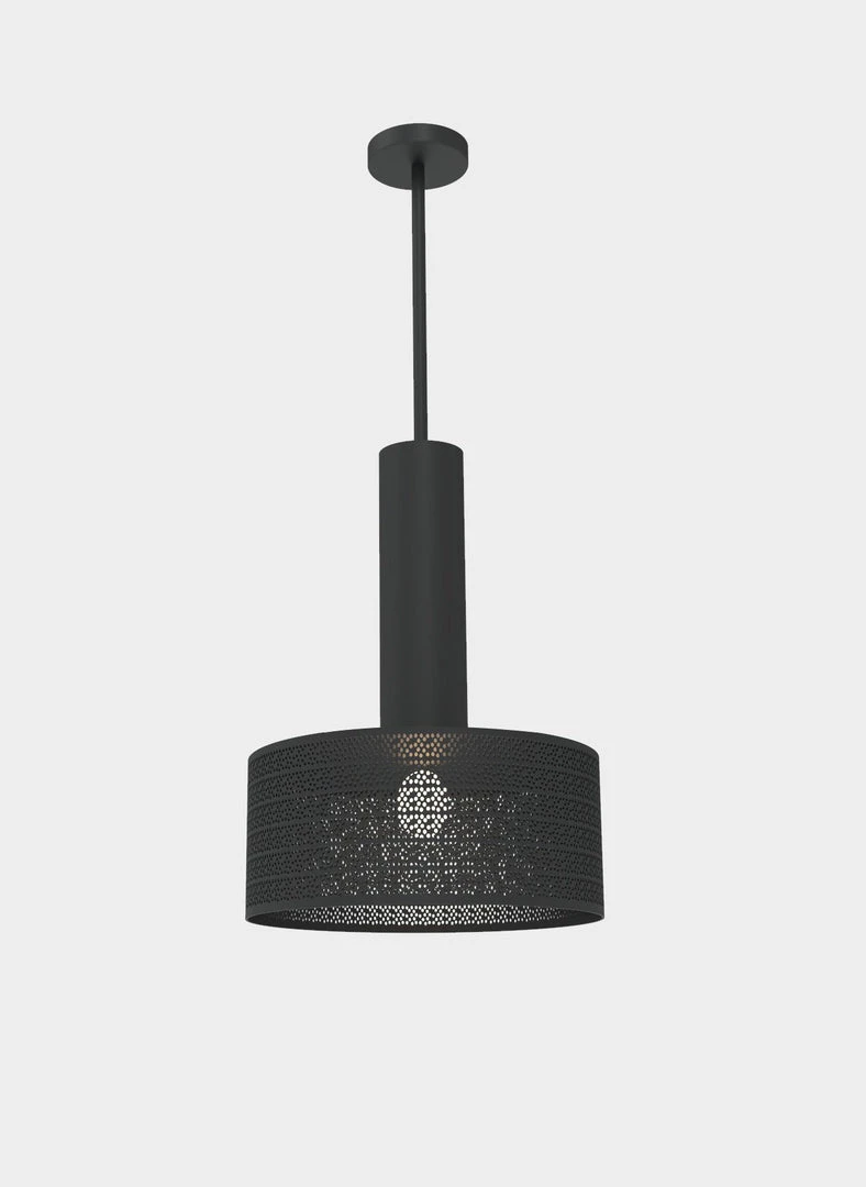 The simple tubular form of the Alula pendant light adds a clean, contemporary feel to any space. Providing diffused, indirect illumination through its perforated metal shade, the fixture is ideal for use in hallways, over counters, or suspended in groups in large entryways.