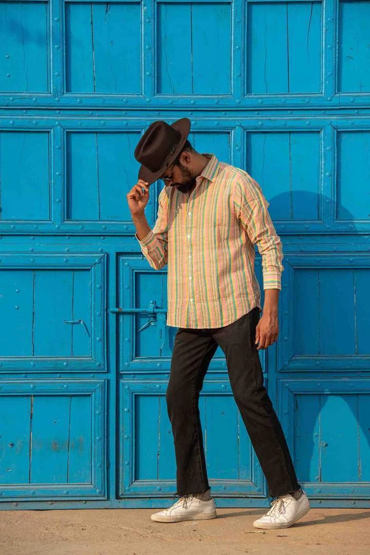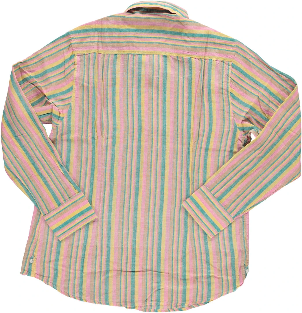 A hand loomed cotton button down shirt with pastel stripes. A men’s sustainable wardrobe staple, this button down shirt can be worn to add excitement to dressed up looks or be worn to elevate everyday casual looks. Design in Los Angeles and made in a fair trade environment in India