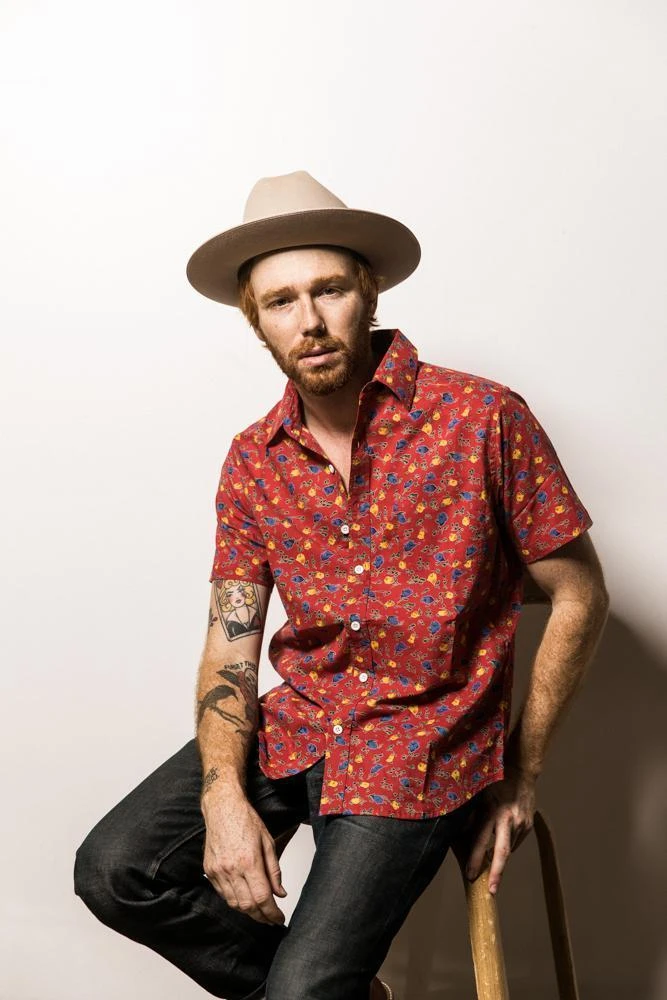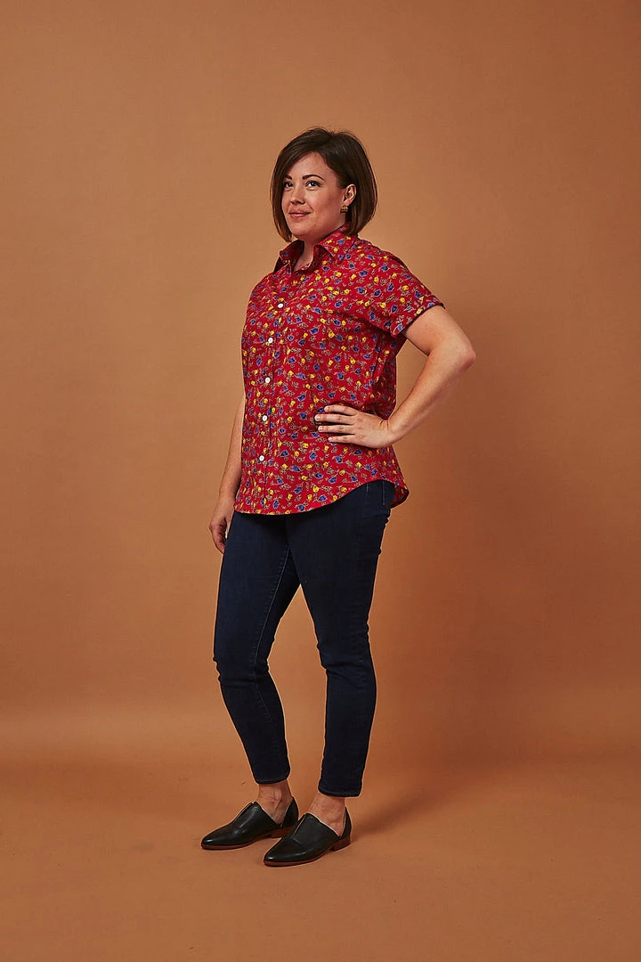 A short sleeve men’s button down shirt with a hand printed floral motif on a maroon background. The perfect addition to men’s sustainable wardrobes, this short sleeve button down can be dressed up or worn casually with its slim fit. Designed in Los Angeles and hand block printed in a fair trade environment in India.
