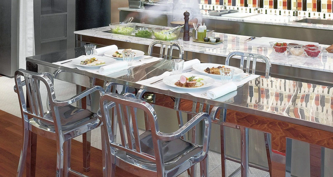 First built for use on submarines in 1944, the Navy Chair has been in continuous production ever since. With the famous 77 step Process, Emeco’s craftsmen take soft, recycled aluminum, hand form, and weld it- then temper it for strength. Finally, the chair is anodized for a durable finish. Emeco guarantees the Navy Chairs for life. Lifestyle photos from La Cuisine at Le Royal Monceau.