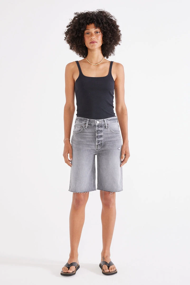 A chic short in an authentic vintage gray wash with subtle abrasion. Fit is easy, sitting comfortably at the waist, with a straight leg finishing just above the knee.