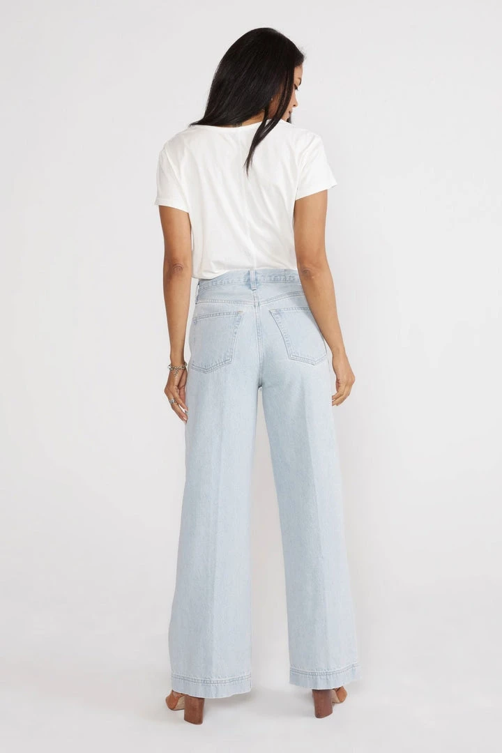 A high rise and a wide leg create a lean silhouette reminiscent of ’70s denim. A bright light wash with careful fading finish the look.