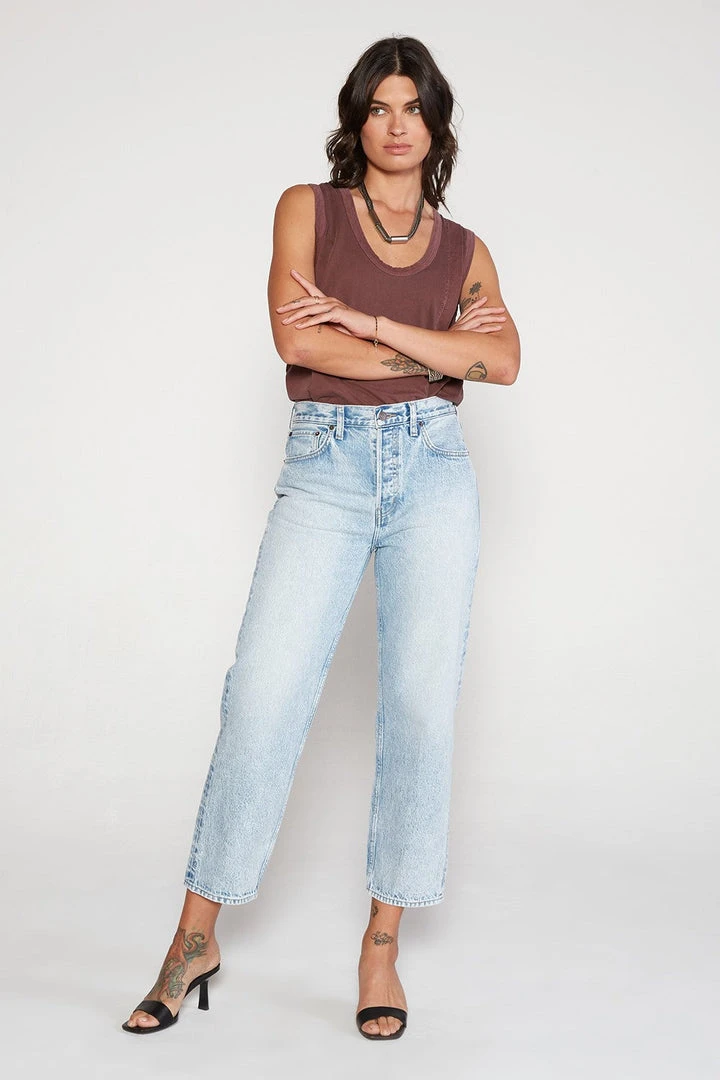 A high-rise straight with authentic vintage styling. Fitted through the hip, easy in the thigh, then straight down to a cropped hem. A cool marbled wash adds an edge to this soft organic cotton/tencel blend denim.