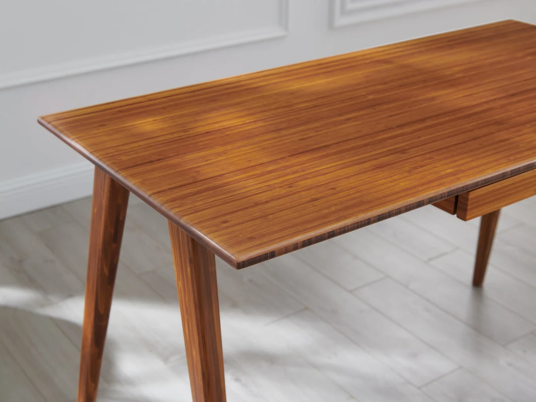Casual and elegant, the Studio Plus writing desk features a tailored profile and a streamlined shape to perfectly accent your home or office. A stylish small-space solution, the scale of the writing desk works well when space is a premium. Tucked underneath the generous work surface is a slim center pencil drawer, and finishing the modern look are handsome splayed legs that elegantly taper towards the floor. Expertly crafted in earth-friendly solid Amber bamboo, the Amber color is not a stain finish, simply an innovation created using earth-friendly heat, steam, and pressure. Creating a beautiful unique grain with continuous color throughout the entire material.