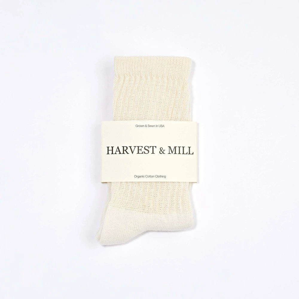These socks are made from natural-white organic cotton. There are no dyes or bleaches used on these socks. Natural-white cotton is creamier in tone than stark bleached white. Crew Socks reach mid-calf. 6 pairs included.
