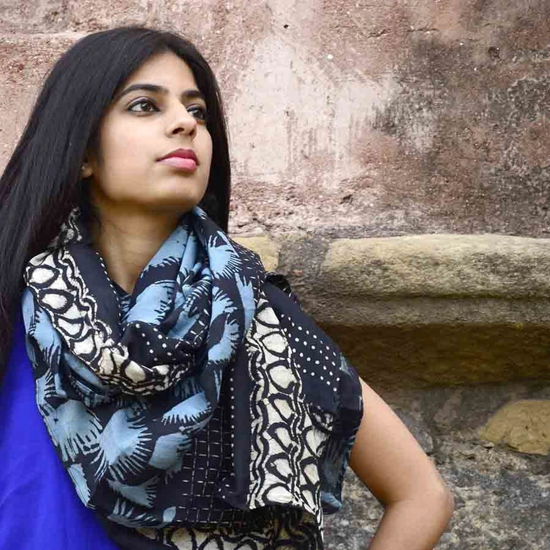 This black white and blue large scarf compliments any outfit with its playful mix of patterns and colors. It is hand block printed and dyed in a bath of natural dyes. Please note that sizes may vary 1-2 inches and color variance may occur based on the intake of natural dyes per fabric.