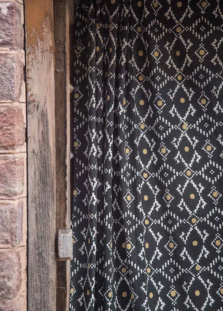 These black and white block print curtains with sprinkles of mustard gold are printed and dyed by hand. The medium weight cotton allows a small amount of light in while providing privacy. The pattern is inspired by the captivating Moroccan architecture. Dipped in natural dyes, and printed on a medium weight cotton fabric, these curtain panels would make a beautiful bold statement in any room.