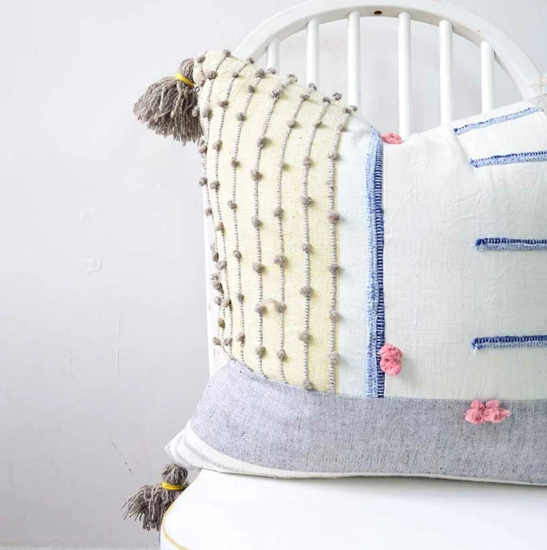 This organic cotton pillow will add texture and color to any space in your home. The colors are light and makes a cozy Hygge setting. The fabric is made from organic cotton that is hand spun and woven by artisan weavers on the handloom.
