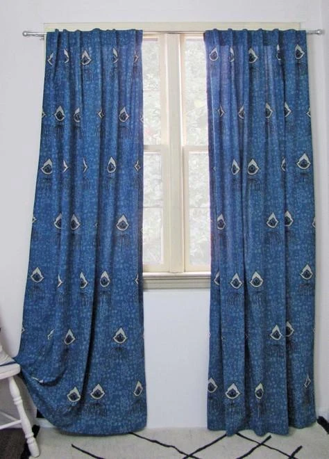 These curtains are made in a mix of blues. These are inspired by the blue amulets that are used to ward off negative energy from the homes. Each curtain is hand block printed and hand dyed to add a burst of color to your space, giving it a gentle filtered light.