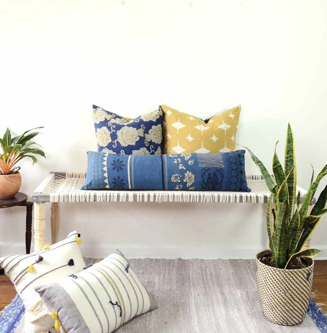 Inspired by the roses, this large square pillow is block printed and dyed naturally in Indigo. The gold color roses and indigo blue make a beautiful pillow for your home.