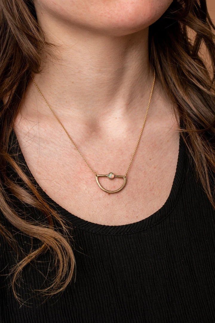 A single brass half circle reminiscent of the waxing moon is dotted with a stone of your choice in the center. A beautifully minimal addition to your jewelry collection. Learn more about lab-grown gemstones on Made Trade Magazine.