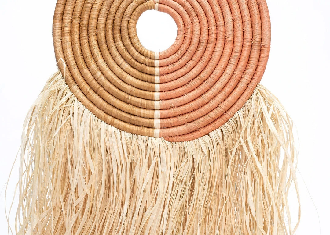 These raffia fringed discs are an incredible statement piece for your home decor. Style it with other plates and baskets, these ready to hang fringed chargers will do all the talking! The exquisite raffia fibers are woven into a disc and then left to hang for a dramatic flair.