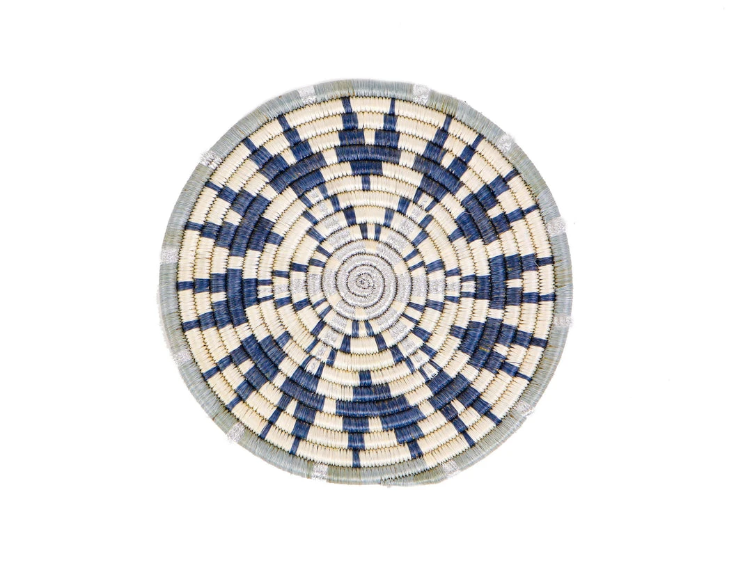 This heat resistant, metaliic silver hot pad is here to set a tea kettle on or hot dish from the oven. With a woven loop attached on the back, they can be hung up as wall decor for a soothing pop of color.