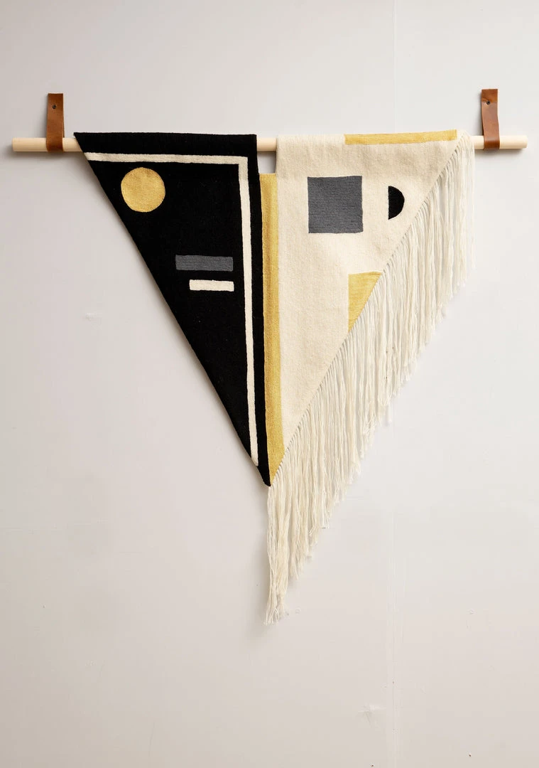 This modern, geometric tapestry has been ethically hand-embroidered by artisans in Kashmir, India, using a traditional embroidery technique that is native to this region.