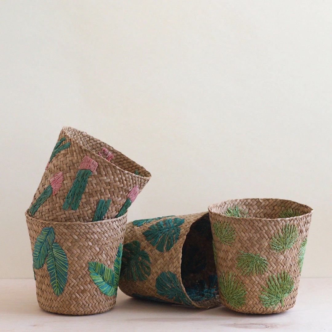These intricately embroidered leaf baskets are designed to complement your plants and bring even more green to your home. Display individually or mix and match for maximum impact. Since each piece is handwoven, please expect slight variation in design, color, shape, and size.