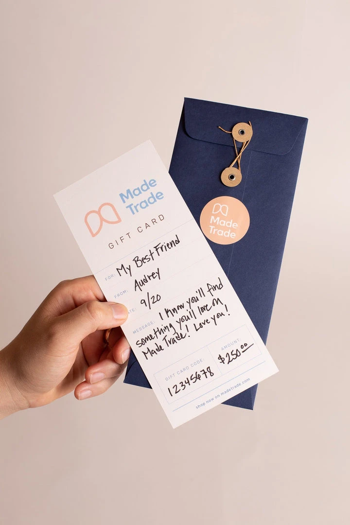 Shopping for someone but not sure what to give them? Let them choose from thousands of ethically and sustainably made goods with a Made Trade Handwritten Gift Card!