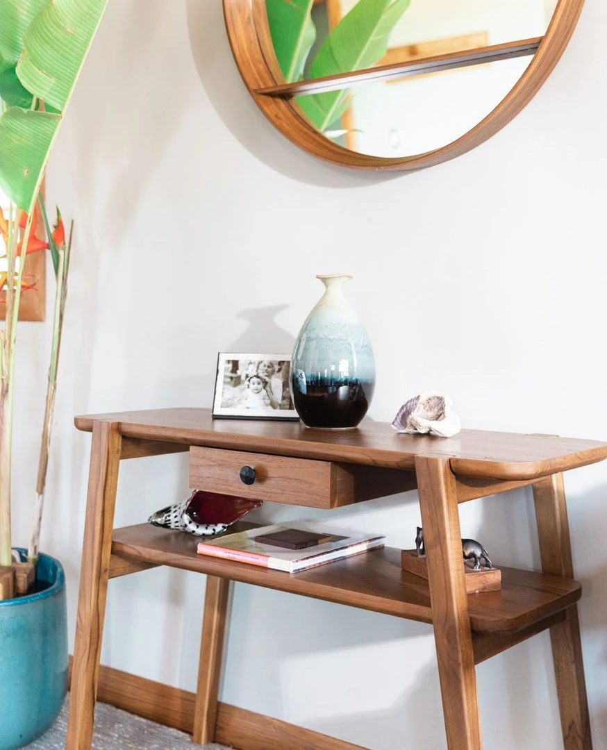 Masaya & Co.’s Apanas Hall Table is a mid-century modern style accent table handmade from sustainably sourced tropical hardwood. It is perfect for entryways, living rooms, bedrooms, dining rooms, or any area suited for an accent table. It also can make a gorgeous TV stand, with a drawer for remotes or other items.