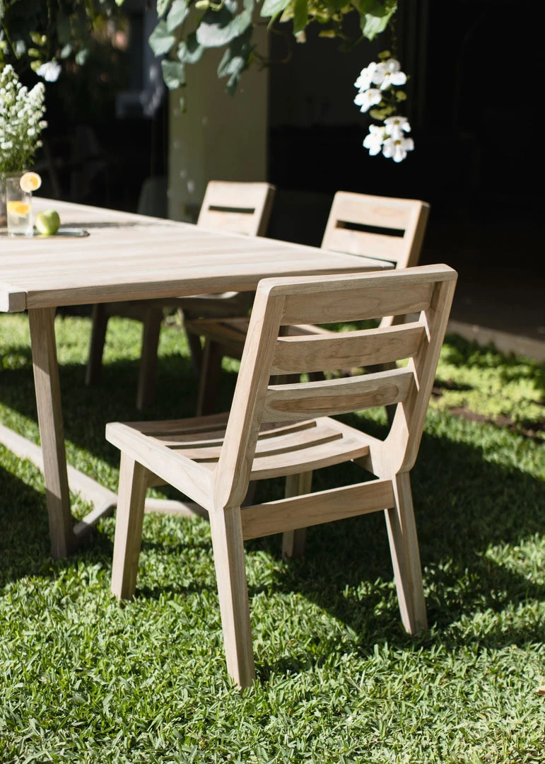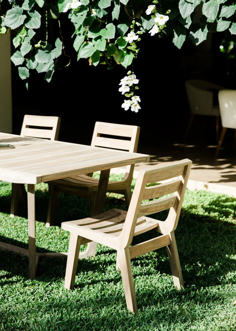 The modern and minimalist, the solid wood Casares Dining Chair is handcrafted from sustainably sourced teak and suitable for indoor or outdoor use.