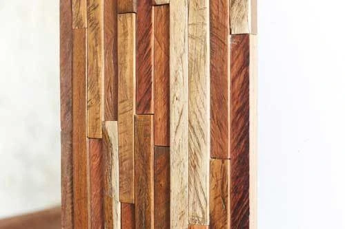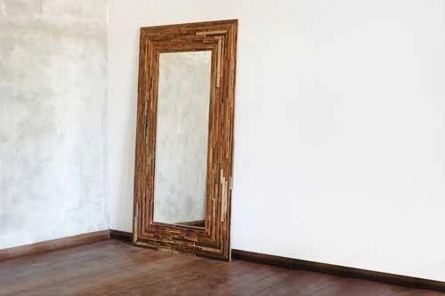 This geo hall mirror makes a tasteful hall, living room, or bedroom mirror. The frame is made from a mix of Rosita Walnut, Royal Mahogany and Teak, blended together in a rustic fashion to provide a solid and attractive frame for this large rectangular mirror.