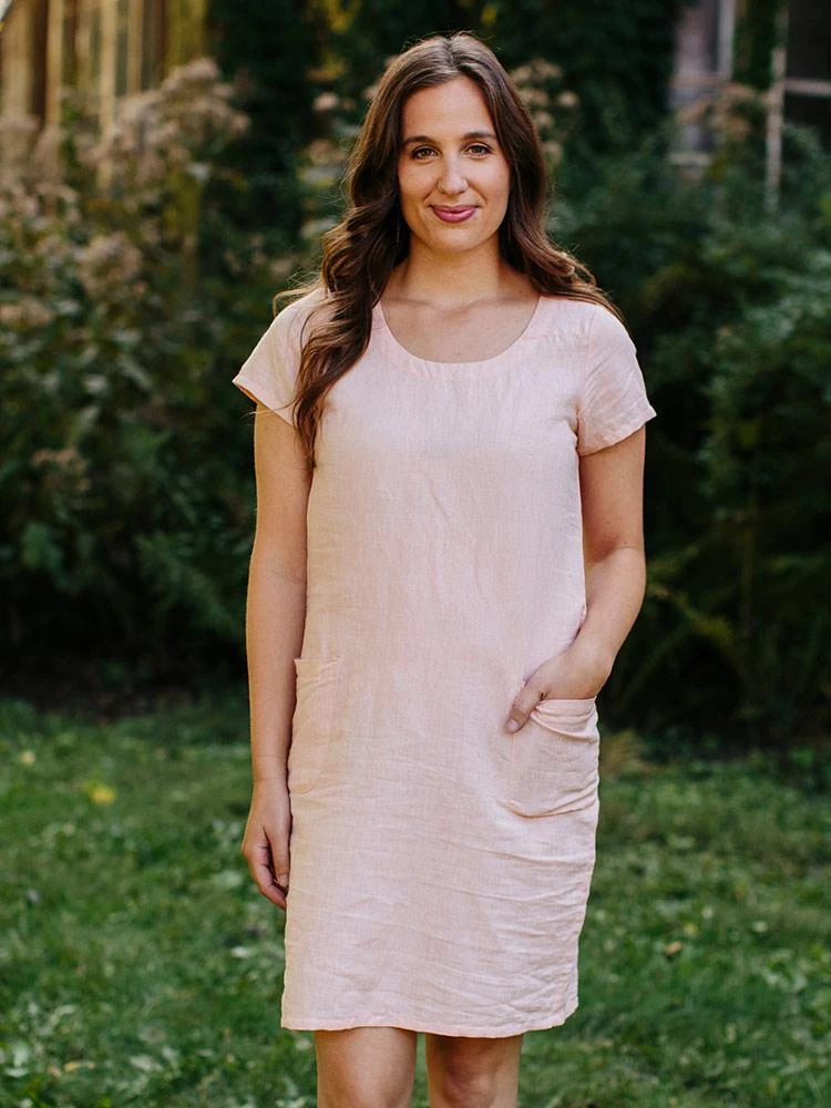 Think pink in this flattering shift dress, in this new linen/cotton blend fabric. Elevate the look with a statement necklace and a pair of simple sandals or booties.