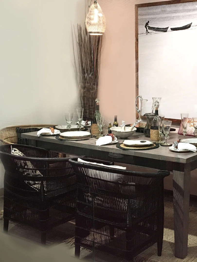 These intricately woven chairs provide authentic style from Malawi. Woven with strips of tropical bamboo, and made sturdy with blue gum tree wooden frame. Intricately detailed, naturally beautiful, the Malawi Cane arm chair adds comfort and style to any space. This striking black chair will pair nicely with any textile and can add a beautiful accent to your space indoors or out.